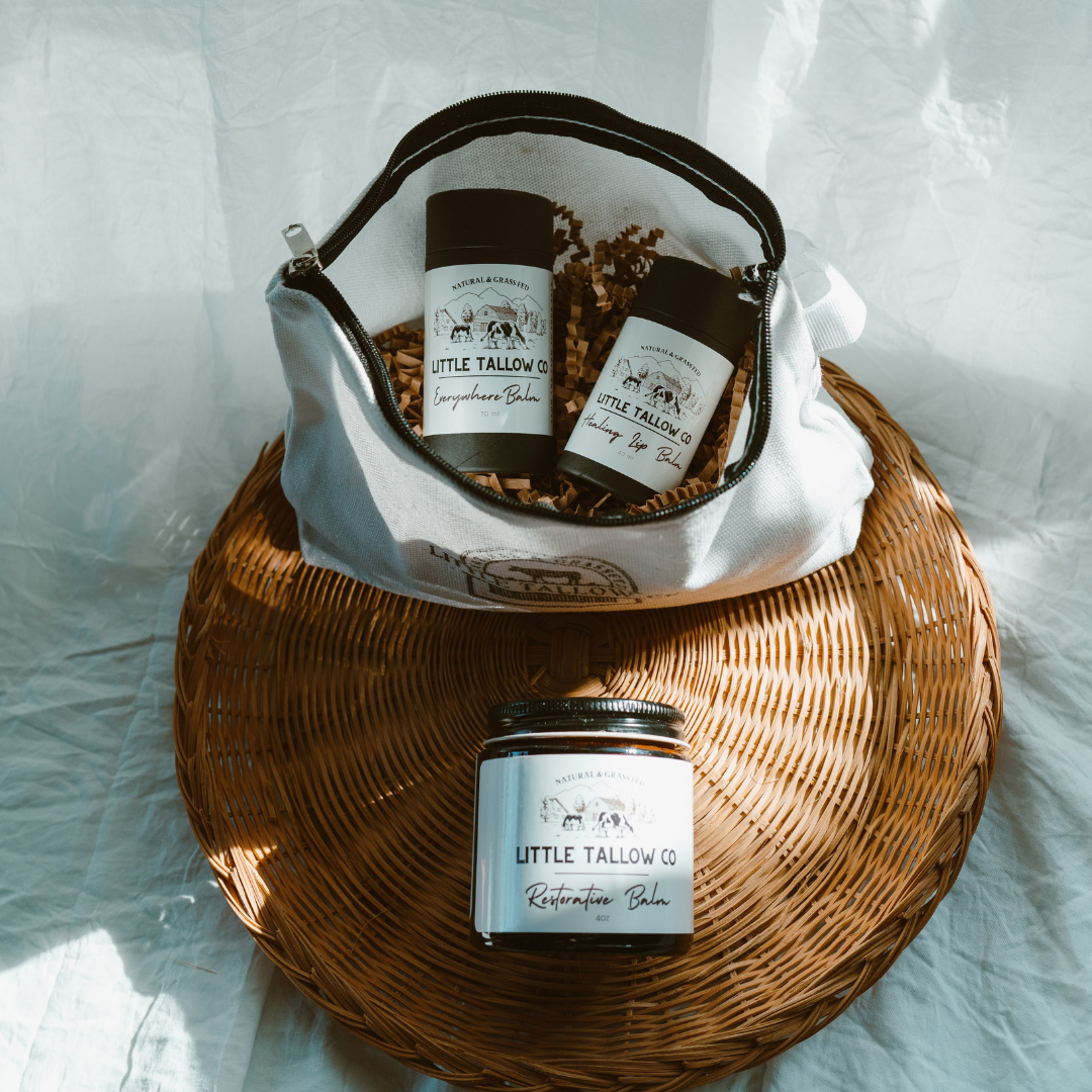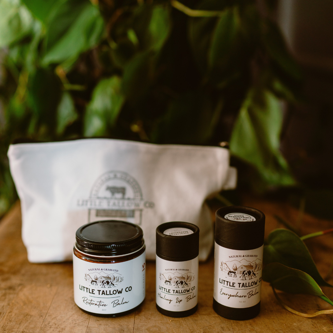 All three are tucked inside a branded Little Tallow Co. canvas zipper bag, making this a beautiful gift for someone you love—or a simple way to stock your own natural skincare staples.