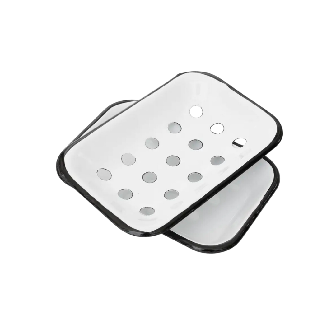 Bring a touch of rustic charm to your bathroom or kitchen with our farmhouse-style soap tray. Crafted from durable enameled metal, this vintage-inspired soap dish combines beauty with practicality. The two-piece set features a bottom tray and a removable top soap holder with drainage holes, ensuring your soap dries thoroughly and lasts longer by staying elevated and away from standing water.