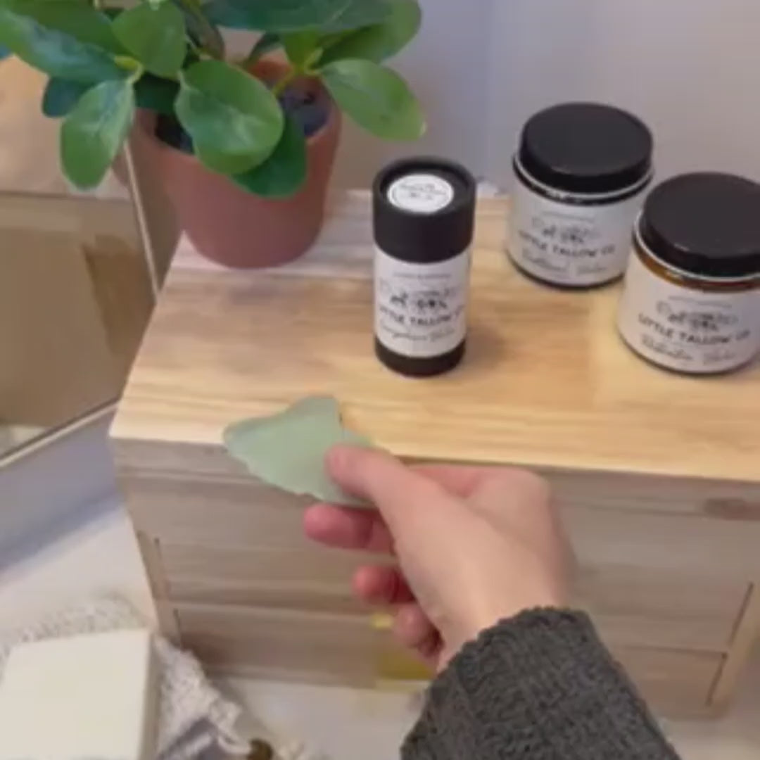 How to Use: Apply a light layer of Tallow Balm or oil to clean skin. Gently glide the gua sha tool upward and outward along the face, neck, or body. Clean with warm water and mild soap after each use.